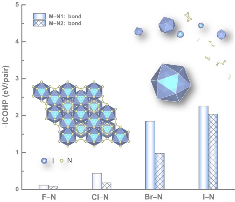 本工作选择碘和氮作为研究对象,利用基于粒子群优化算法的晶体结构预测方法CALYPSO,系统研究了高压下卤族元素外壳层的能量变化和富氮型卤族氮化物形成的可能性。首次预言了一种具有碘十二重超配位特征的新型高压碘氮化合物IN6。IN6由氮的六元环和反常的碘氮共价键三维堆垛而成,具有二十面体笼型结构特征,其中碘原子位于二十面体中心。高压和氮六元环协同作用,有效降低了碘的5d轨道能级,使得它们成为价态轨道,进而导致了碘氮共价键的形成。高度对称化的共价键网络有利于卤素十二重超配位的形成。同时,研究发现随原子序数降低,卤族元素的高压价态扩展能力逐渐降低。