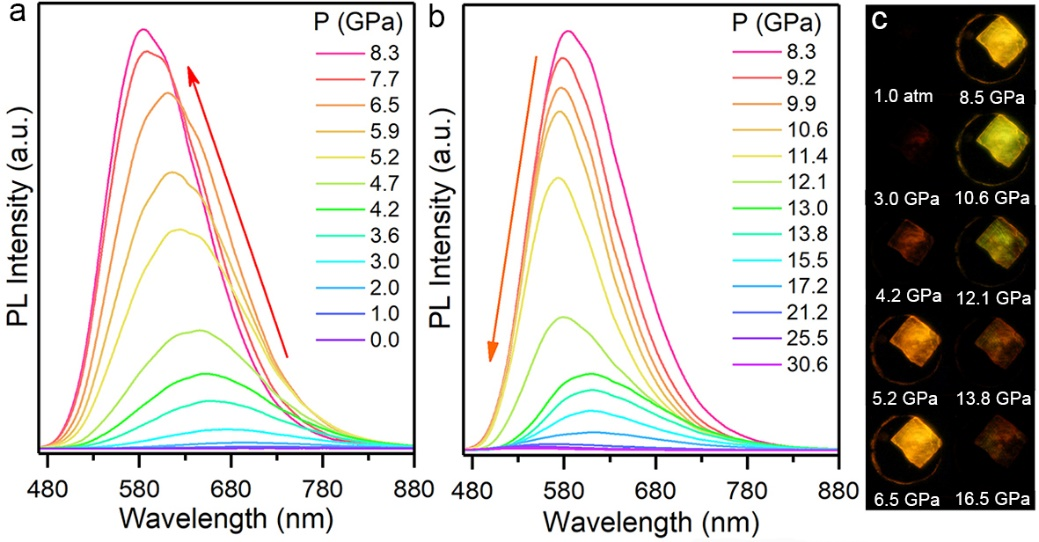 该工作观察到了压力驱动的自陷态激子从“暗态”到“亮态”的转变,对应着强的宽带斯托克斯位移发射和长的载流子寿命。进一步的理论分析表明,受抑制的晶格畸变和增强的激发态电子维度在形成稳定的亮自陷态激子中起着重要作用,它们可以分别调控自陷能和晶格形变能,在基态和激发态势能曲线之间形成能量势垒,增强电子-空穴轨道重叠。该工作提出的光物理机制突出了控制自陷态激子动力学过程和激发态行为的重要性,强调了通过控制结构刚性来调控激发态结构形变和电子-声子耦合强度以实现高效自陷态辐射复合的必要性。邹勃团队于2018年提出了压强诱导发光的概念,该工作从理论和实验出发,进一步阐明了压强诱导发光的物理化学机制,在固态照明器件的光电材料设计上有潜在的应用前景。