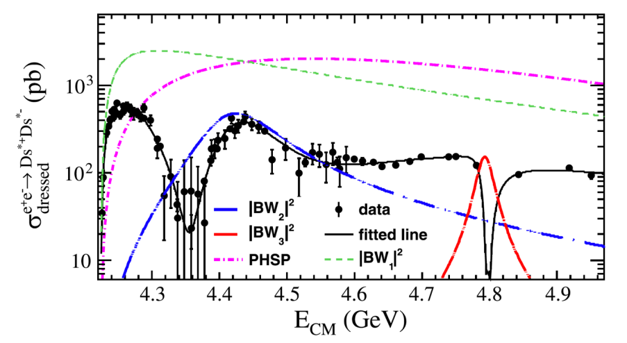 宋维民教授课题组及合作者利用北京谱仪实验获取的世界上最大的粲能区正负电子对撞样本,以前所未有的精度测量了e+e− →Ds*+Ds*−过程的反应截面,截面的形状揭示了粲夸克偶素的诸多新性质,尤其是在质量为4.79 GeV处(图中红线)以超过5倍标准偏差的显著性发现了新结构,这极有可能是一个新发现的粒子。
