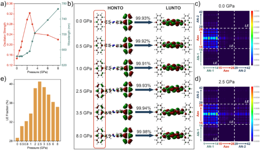 图2. 理论计算AN-Azo-AN在高压下激发态的振子强度、发射波长、自然跃迁轨道、跃迁密度矩阵以及局域激发成分占比