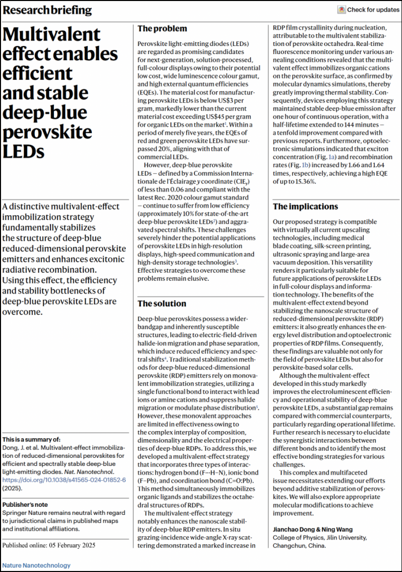 凝聚态物理系王宁教授撰写的题为“Multivalent effect enables efficient and stable deep-blue perovskite LEDs” (Nature Nanotechnology, 2025, DOI: 10.1038/ s41565-025-01855-x)的Research Briefing文章。