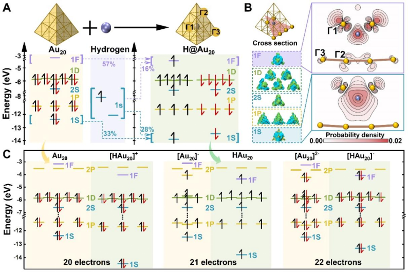 1. 结构与能级图。(A) Au20H@Au20优化结构的示意图(Γ1表示面心金原子,Γ2表示棱边金原子,Γ3表示顶角金原子),以及它们的超原子分子轨道能级图和相应的轨道成分分析。(B) H@Au20中氢原子贡献显著的轨道概率密度分布。超原子分子轨道的等值面取值为0.01。(C) Au20[H@Au20]+20电子超原子)、[Au20]-H@Au2021电子超原子)、[Au20]2-[H@Au20]-22电子超原子)的能级图。所有体系的能级均以Au202S轨道为基准进行对齐校准。校准因子分别为:[H@Au20]++2.94 eV;[Au20]--2.67 eV;H@Au20+0.11 eV;[Au20]2--5.41 eV;[H@Au20]--2.70 eV。图底部标注的电子数代表超原子电子数目。20电子和22电子超原子为闭壳层结构,21电子超原子为开壳层结构。(1F仅代表1Fxyz轨道。)