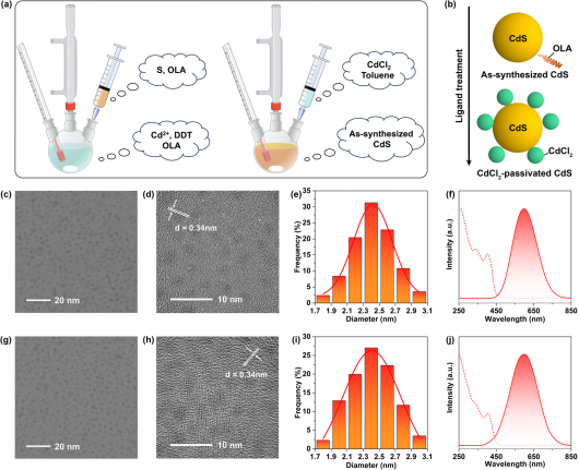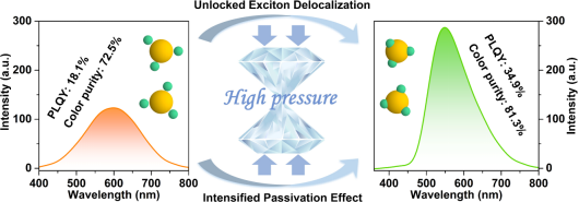 近日,香蕉视频 高压与超硬材料全国重点实验室肖冠军教授等人在传统CdS量子点表面缺陷态的压力调控研究中取得重要进展。研究团队通过选择结合力更强、配位位点更丰富的原子配体CdCl2,成功合成新型包覆结构的CdS量子点。高压处理进一步强化了量子点与配体之间的相互作用,有效修饰了其表面态,促使激子向量子点表面离域扩展。压力有效优化了CdS–CdCl2界面,促进激子离域与表面钝化效应,从而显著提升了发光性能。该研究为拓展量子点材料在光电子学领域的应用提供了新颖的设计思路与理论依据。相关研究成果以“Enhanced Excitons Delocalization Toward High-Quality Emission Harvesting Unlocked by Pressure and Ligand Engineering”为题发表在《Nano Letters》上。