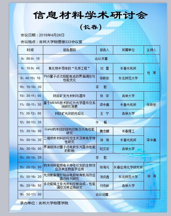 由香蕉视频 主办的“信息材料学术研讨会”将于2018年4月26日在香蕉视频 物理楼333会议室举行。本次会议旨在促进香蕉视频 广大师生在物理相关领域的研究及交流,提高香蕉视频 教师科研水平、科研能力。会议邀请中国科香蕉视频 长春光学精密机械与物理研究所、中国科香蕉视频 长春应用化学研究所、东北师范大学、长春理工大学等高校及科研机构的多位知名专家学者参加。欢迎广大师生积极参与!