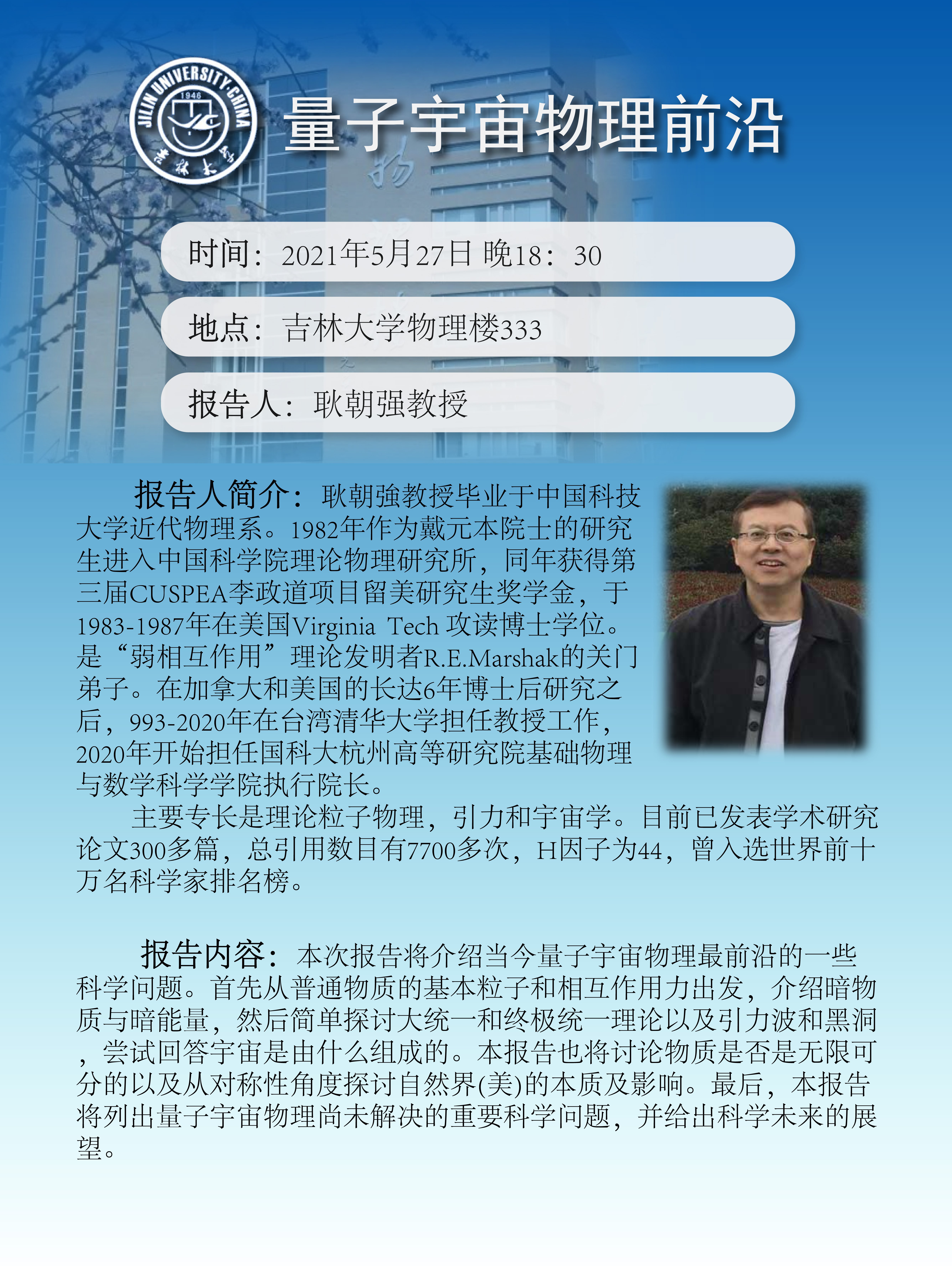 本次报告将介绍当今量子宇宙物理最前沿的一些科学问题。报告将首先从占宇宙5%的普通物质出发,演示已知的基本粒子和相互作用力,介绍27%的暗物质和68%暗能量以及我们对它们的本质及来源之认知,然后简单探讨大统一和终极统一理论的可能性以及引力波和黑洞,尝试回答宇宙是由什么组成的。本报告也将讨论物质是否是无限可分的以及从对称性角度探讨自然界(美)的本质及影响。最后,本报告将列出量子宇宙物理尚未解决的重要科学问题,并给出科学未来的展望。