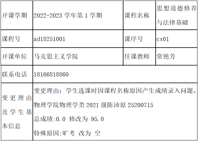 根据《关于进一步明确本科生课程考核等有关问题的通知》(校教字[2018]47号)文件有关精神,现对一下课程成绩更正进行公示: