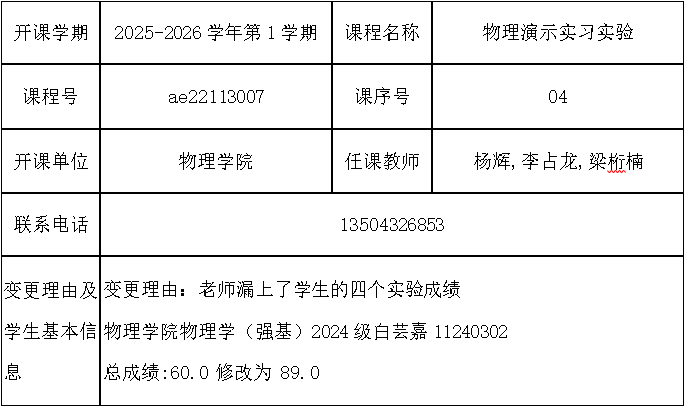 根据《关于进一步明确本科生课程考核等有关问题的通知》(校教字[2018]47号)文件有关精神,现对以下课程成绩更正进行公示: