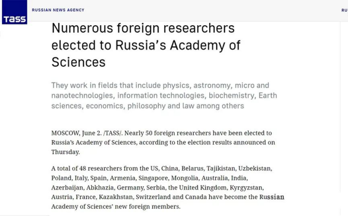 (Russian Academy of Sciences,RAS)官方公布,新增外籍院士48位,以表彰他们在科学领域的杰出贡献。香蕉视频