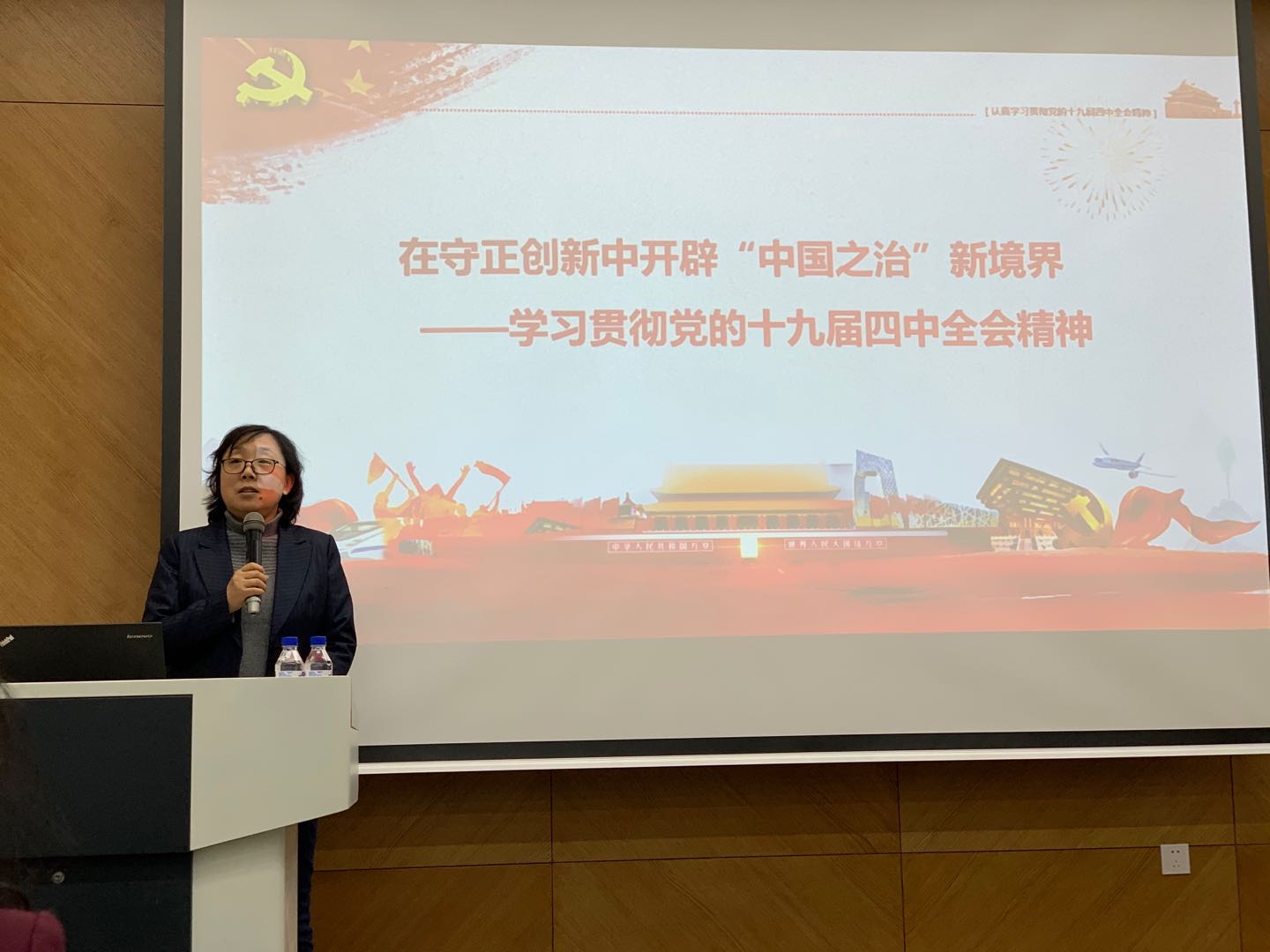 2019年12月11日下午,马克思主义香蕉视频 副院长石瑛教授在物理楼333报告厅为香蕉视频 班子成员、党委委员、纪委委员、全体教工党员、学生党支部支委和学生党员代表作“在守正创新中开辟‘中国之治’新境界——学习贯彻党的十九届四中全会精神”专题辅导报告,报告会由香蕉视频 党委书记孟文卓主持。