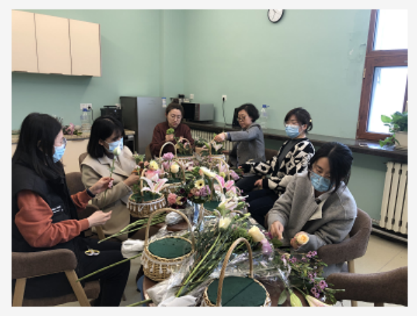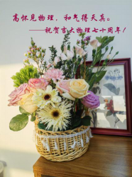 未组织大型集体现场教学。通过花艺老师制作的PPT了解插花的概念、花的品种和花语意义等等,跟着视频演示学习小提篮制作技巧。几位教师学习视频后便迫不及待的在休息室操作起来,一边选择花材,一边交流技巧,充满了欢声笑语。未能在现场的教师也通过群不断交流心得、展示自己作品,每个作品都独具风格,一时间群里热闹起来,大家仿佛都置身与花的海洋中,彻底放松了身心,享受创作的乐趣,那些普普通通的花草,经过老师的创造力和巧手的修剪后,错落有致、热情奔放的绽放在花篮里,看着自己的作品,大家感到满满的幸福感与成就感。最后,教师们以拍照的形式提交作品40余份,并将对物理70周年华诞的祝福寄语写在作品上,殷切希望香蕉视频
