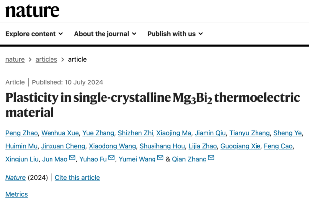 物理研究所王玉梅副研究员等人合作,在塑性半导体功能材料方面取得了重大突破,首次发现层状结构的Mg3Bi2单晶室温下兼具有优异塑性和高热电性能,面内拉伸应变接近100%、热电优值zT~0.65,理论与实验结合,揭示了塑性变形的微观机制。这一重大研究成果以“Plasticity in single-crystalline Mg3Bi2 thermoelectric material”为题,于2024年7月10日发表在Nature上。