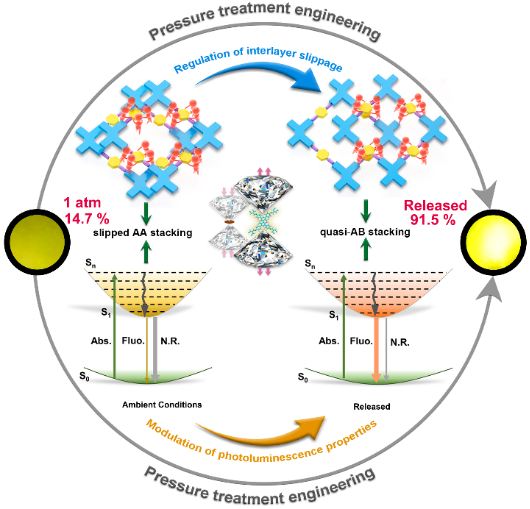 高性能智能光致发光材料在显示器件、生物成像及化学传感等领域具有广阔的应用前景。COFs材料因其长程有序的π共轭结构、可定制的功能基元,以及丰富的电子跃迁模式,为构建智能响应型发光材料提供了独特的平台优势。然而,由于存在π-π堆积和分子内旋转等非辐射跃迁过程,在COFs材料中实现高品质发光高压相的常压截获一直是该领域亟待解决的关键科学问题。此前,杨新一教授课题组利用压强处理工程成功实现MOFs材料的单色荧光增强(Angew. Chem. Int. Ed. 2022, 61, e202210836)、压强诱导MOFs材料蓝色/多色发光并截获(Adv. Mater. 2023, 35, 2211729; Adv. Mater. 2024, 36, 2403281)、压强诱导有机分子材料多色发光并截获(Nat. Commun. 2025, 16, 8780)、压强诱导MOFs材料多色可调荧光/磷光发射并截获(Nat. Commun. 2025, 16, 696; Nat. Commun. 2025, 16, 4166)、压强诱导有机小分子白光发射并截获(Nat. Commun. 2024, 15, 7778)、压强调控主客体卤键有机框架实现全可见光谱变色(Nat. Commun. 2026, 17, 1682)。基于前期对材料光物理过程的有效调控,杨新一课题组利用压强处理工程和增强的空间位阻效应改变COFs的分子堆积构型,在环境条件下实现了COFs的高品质发光。