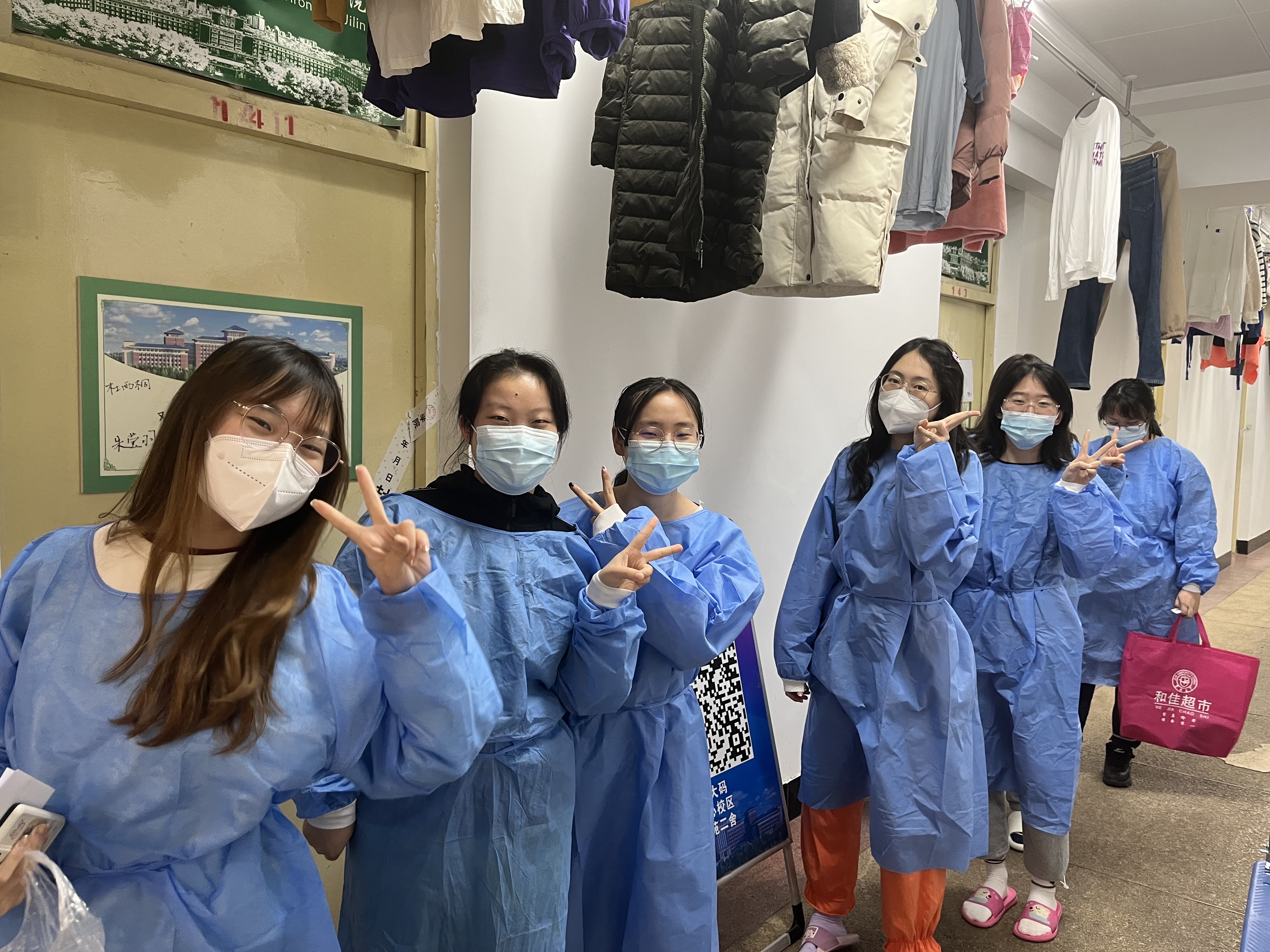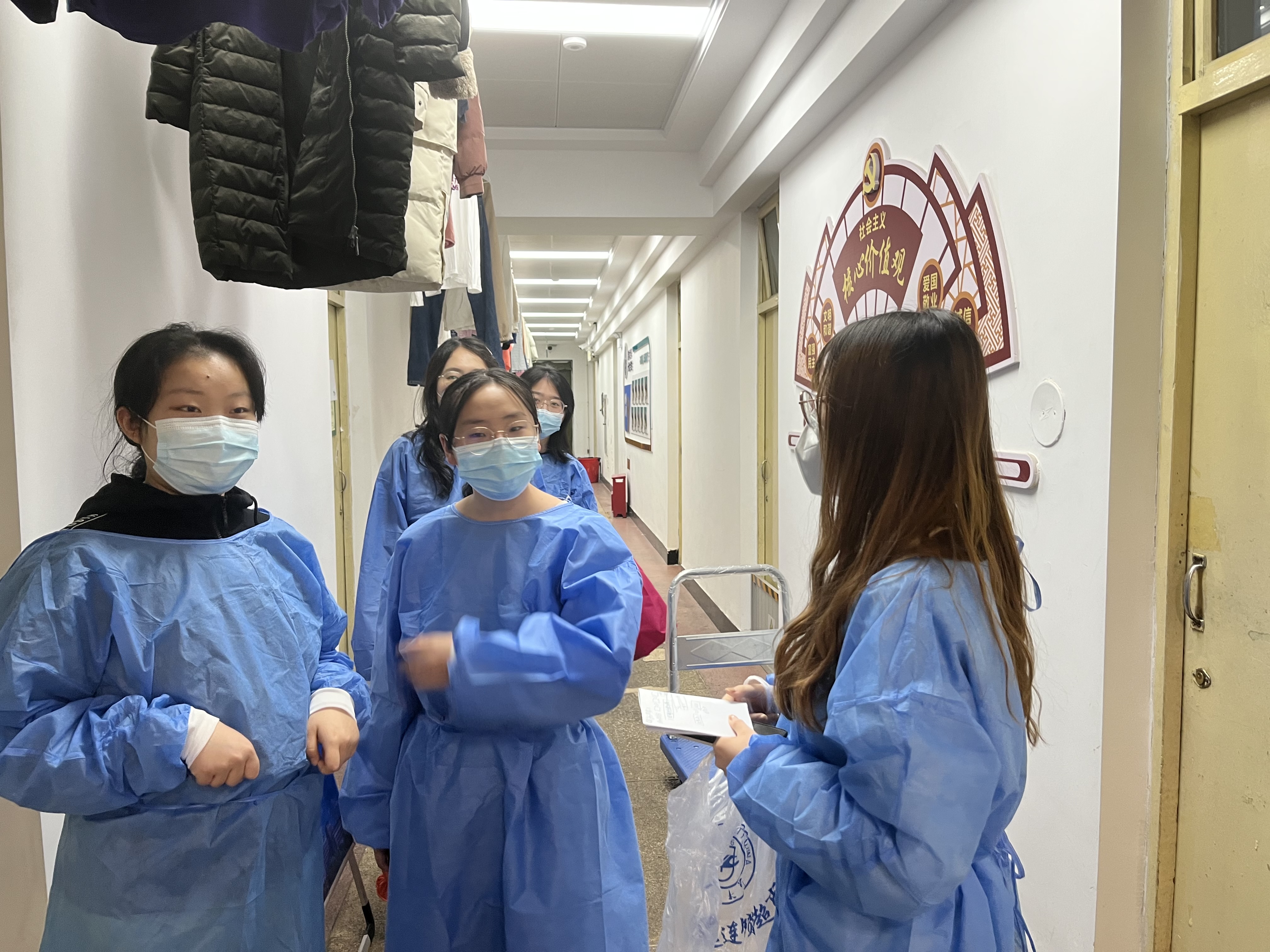和楼内通知,统计数据,为大家解决生活上出现的问题和南二物院志愿者们的工作安排。我们的志愿者同学们每天为大家配送三餐和水,发放防疫物资、抗原自检卡、致远物资,还有帮楼内清洁阿姨回收餐盒。志愿者同学们的工作都很辛苦,经常需要六点多起床配送早餐,物资也很沉重女孩子们搬起来很困难,有时还需要帮忙把全楼的饭和水搬下车,但是,所有的志愿者们没有过一句抱怨,对所有的安排都积极配合,齐心协力,共同为保障同学们的封寝生活安心、舒心而努力。