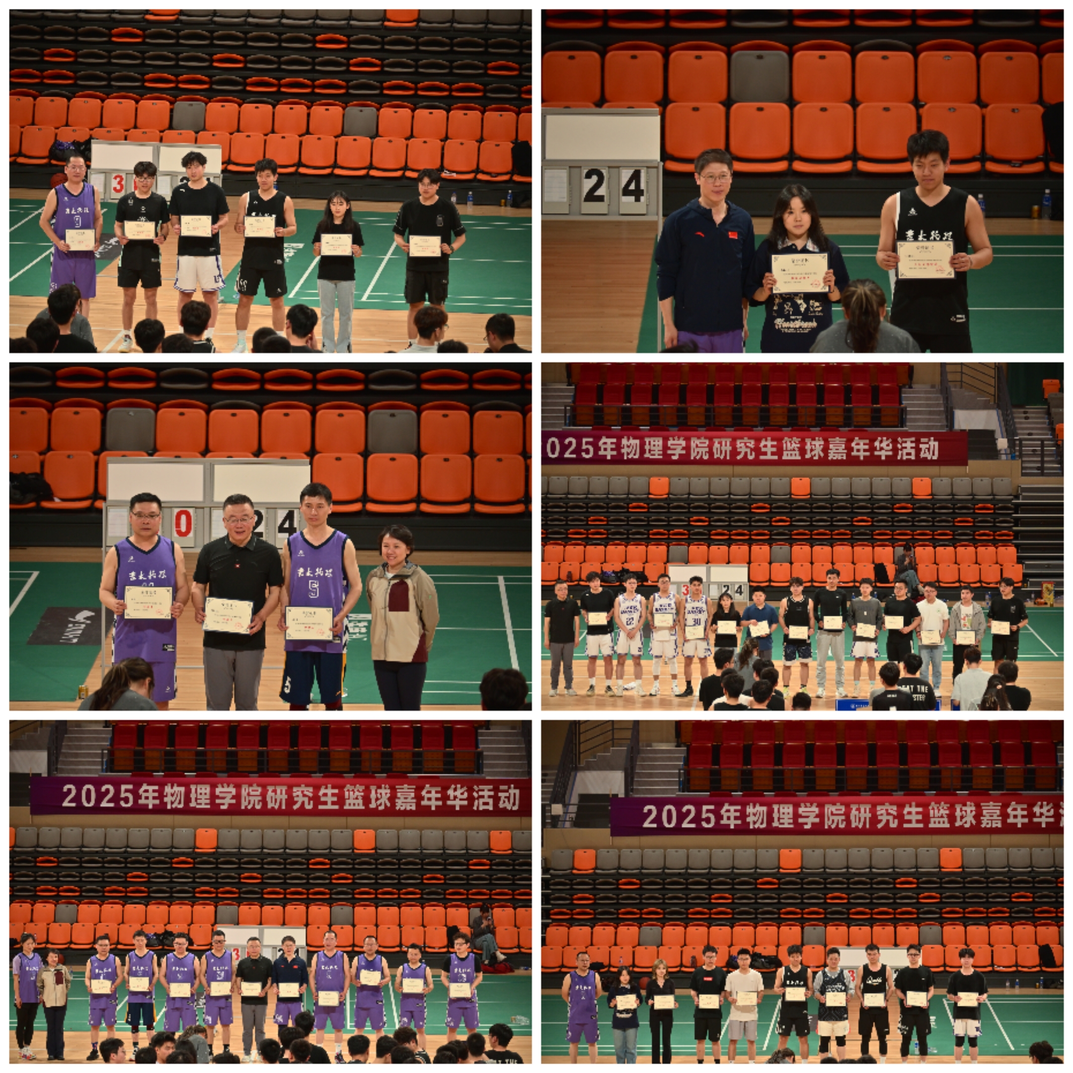 教工队与学生组成的“勇敢”队会师决赛。决赛中,双方比分胶着,教工队凭借经验沉着应战,学生队以青春活力奋勇追击,充分展现导学同台竞技的独特魅力。最终,“勇敢”队凭借关键防守与反击上篮夺冠,物理教工队获亚军,“Homiparty”队和“嘿嘿嘿”队并列季军。此外,郑兆凯同学荣获MVP;隋永明、李全军、杨新一三位老师获得拼搏奖;高聪同学凭借中场投篮环节的出色表现,摘得最佳女投手称号。