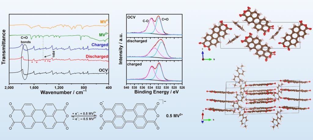 近年来,以非金属离子为载流子的水系二次电池体系以其在价格成本和电池安全性上的优势,被视为规模储能领域中的理想选择。区别于金属离子与宿主电极材料间的离子键作用,非金属载流子与电极之间的相互作用规律和拓扑嵌入脱出机制更是吸引了学术界广泛关注。该研究团队以芳香族甲基紫精离子(Methyl Viologen)和有机物分子3,4,9,10-苝四甲酸二酐(PTCDA)分别作为载流子和电极材料,构建了水系全有机物电池体系,并深入探究了非金属离子二次电池体系内的化学键本质,以及离子迁移和电荷储存过程。