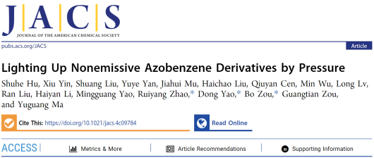 超硬材料国家重点实验室邹勃教授联合超分子结构与材料国家重点实验室姚栋副教授、青岛科技大学赵瑞阳教授,首次在有机材料中实现了“从无到有”的压强诱导发光(PIE)。该成果以“Lighting Up Nonemissive Azobenzene Derivatives by Pressure”为题,发表于《美国化学会志》(J. Am. Chem. Soc. 2024, 10.1021/jacs.4c09784)。该工作得到了超硬材料国家重点实验室邹广田院士和华南理工大学马於光院士的悉心指导与支持,还得到香蕉视频