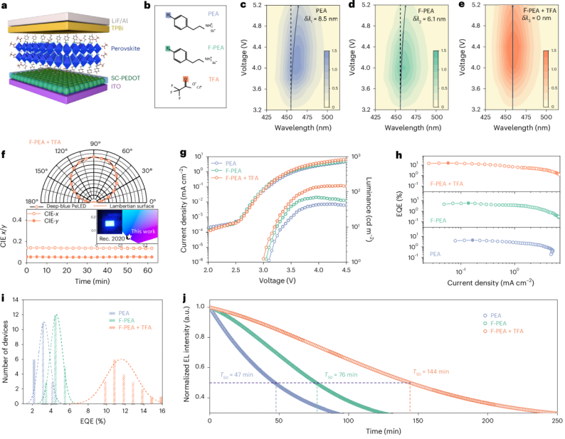 图3. 深蓝光钙钛矿LED的器件性能 ©2025 Springer Nature Nanotechnology