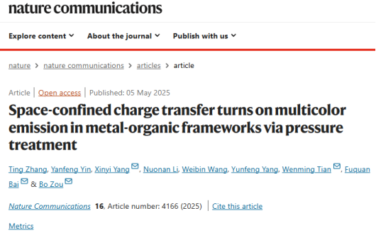 白福全教授等人合作,在金属-有机框架(MOFs)材料的多色可调荧光/磷光领域取得重要突破。通过压强工程调控镉基金属-有机框架(MOFs)材料的电荷转移动力学,实现单组份MOFs材料Cd(BDC)(DMF)的高效多色可调荧光/磷光发射。相关成果以“Space-Confined Charge Transfer Turns on Multicolor Emission in Metal-Organic Frameworks via Pressure Treatment”为题发表在《Nature Communications》(Nat. Commun. 2025, 16, 4166)上。