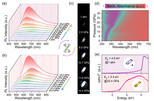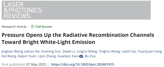 近日,香蕉视频 高压与超硬材料全国重点实验室邹勃教授团队肖冠军教授等人在全无机非铅金属卤化物的压强诱导发光研究中取得重要进展,通过高压打开了辐射跃迁通道,实现了一维金属卤化物Cs2AgI3“无光”到“有光”的反常压强诱导PIE行为(Pressure-Induced Emission, PIE),产生了高压下的高品质明亮白光发射,并深入揭示了背后的物理机制,推动了压力传感、压力开关和高压极端条件下的特种照明与显示应用。相关研究成果以“Pressure Opens Up the Radiative Recombination Channels Toward Bright White-Light Emission”为题发表在《Laser & Photonics Reviews》上。