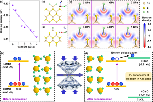 研究结果证实高压有效钝化了表面缺陷。利用基于多体微扰理论的GW近似结合贝特-萨尔普特方程求解,验证了体系中激子效应的存在。为深入探究激子离域与荧光增强之间的关联机制,本研究系统考察了反I型CdS@CdSe量子点、准II型CdS@ZnS量子点以及更大粒径的CdS量子点三种体系在高压下的光学行为。对比实验结果明确表明,激子离域在光致发光增强过程中发挥了关键作用。简化的分子轨道计算进一步揭示,激子离域导致CdS量子点激子半径扩大,从而增强发光性能并引起吸收光谱红移。本研究提出了一种基于压力与配体工程协同作用的有效策略,为实现可控表面修饰,制备高质量半导体量子点提供了新思路,拓展了量子点材料在光电子学领域的应用前景。