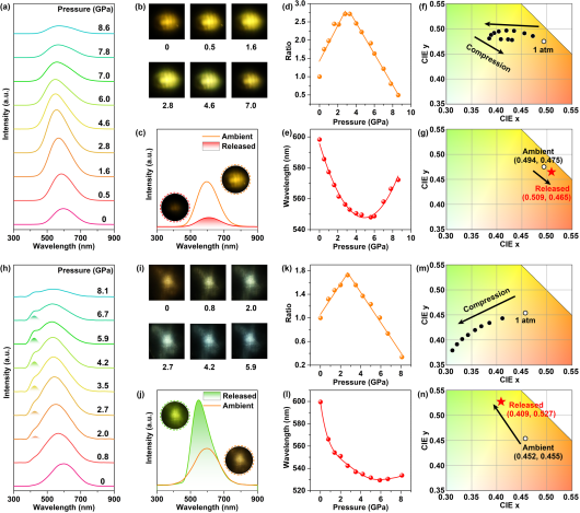 固态照明技术凭借其极高的光电转换效率和长寿命等优势,成为推动绿色低碳照明发展的关键力量。当前,开发新型半导体材料是实现更高能源利用率、推进可持续发展的重要途径。在众多材料中,量子点因其高发光效率、低生产成本和广色域覆盖能力,正逐步取代传统LED,占据市场主流。由于尺寸微小,量子点具有高比表面积,导致其物理化学性质强烈依赖于表面态的调控。通常情况下,表面原子因配位不饱和而形成大量悬挂键,进而显著降低量子点器件的性能。压强作为一种独立于温度和组分的热力学参量,能够有效缩短原子间距、调控材料的电子结构,为物质科学研究提供了新的维度和手段。在前期研究中,邹勃教授团队肖冠军课题组通过对CdSe量子点施加压力,有效增强了配体对表面无辐射缺陷的钝化作用,使其荧光强度提升了一个数量级以上(J. Am. Chem. Soc. 2018, 140, 13970−13975)。2024年,该团队进一步利用不同类型配体对CdS进行表面钝化,在高压下实现了其本征发光与缺陷发光的选择性增强,并最终获得白光发射,也为通过高压研究指导常压合成,进而服务常压科学奠定基础(CCS Chem. 2025, 7, 160–169)。2025年,该课题组系统研究了高压下不同配体包覆量对CdS光学性能的影响,在同一材料与选择性配体复合体系中,分别实现了从橙光到白光以及从橙光到蓝紫光的两类压致变色调控(Laser Photonics Rev. 2025, 19, 2401971)。