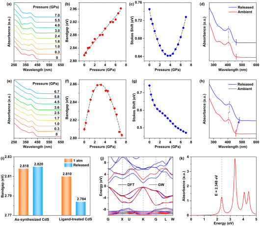 本工作通过压力处理工程,实现了CdS量子点表面态的优化并截获至常压。高压下,CdS量子点呈现从橙色到青色的压致变色行为。卸压后,其发光颜色可稳定保持在绿色,同时光致发光量子产率由18.1%提升至34.9%,色纯度由72.5%提高至81.3%。高压吸收光谱表明压力优化CdS–CdCl2界面,促进激子离域与表面钝化效应,从而显著提升了发光性能。进一步对高压下CdS表面缺陷态密度变化进行分析,量子点发射的光子能量可表述为: