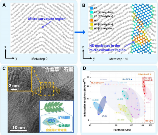 “仿生曲率诱导”的金刚石超硬材料结构设计和实验制备。研究团队从含羞草叶片的曲率响应中获得仿生启发,通过在石墨前驱体中引入微米级曲率结构,实现了应力场的调控和设计,从而主导金刚石的相变路径与界面演化,构建出立方六方异质结构。该结构有效抑制位错运动并耗散裂纹能量,实现了硬度与韧性的协同提升,为超硬材料的结构设计和可控合成提供了新思路。
