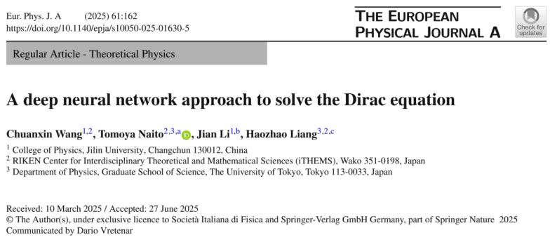 2024届物理学唐敖庆班本科毕业生王传新以及理论物理中心李剑教授,联合日本东京大学梁豪兆教授和理化学研究所(RIKEN) 内藤智也博士,在机器学习求解相对论量子力学问题方面取得重要进展。该工作首次成功利用无监督深度神经网络求解狄拉克方程,为研究原子核、凝聚态物理中的复杂量子多体问题开辟新路径。研究成果以“A deep neural network approach to solve the Dirac equation”为题,发表于欧洲物理杂志A《The European Physical Journal A》(DOI: 10.1140/epja/s10050-025-01630-5)。