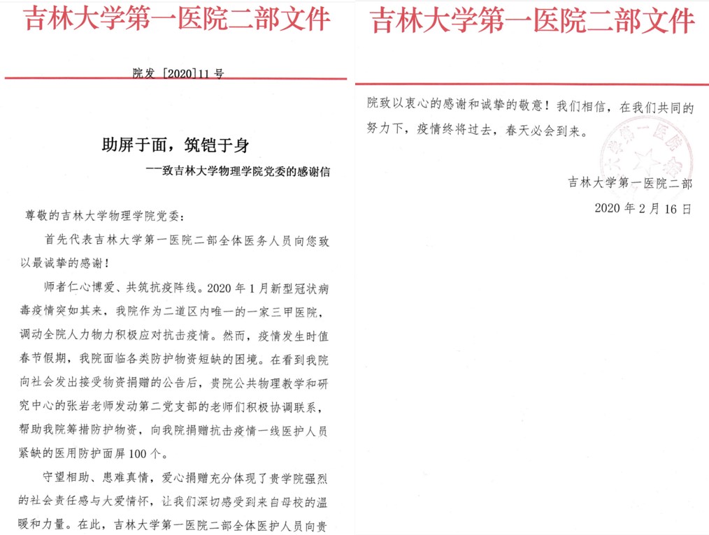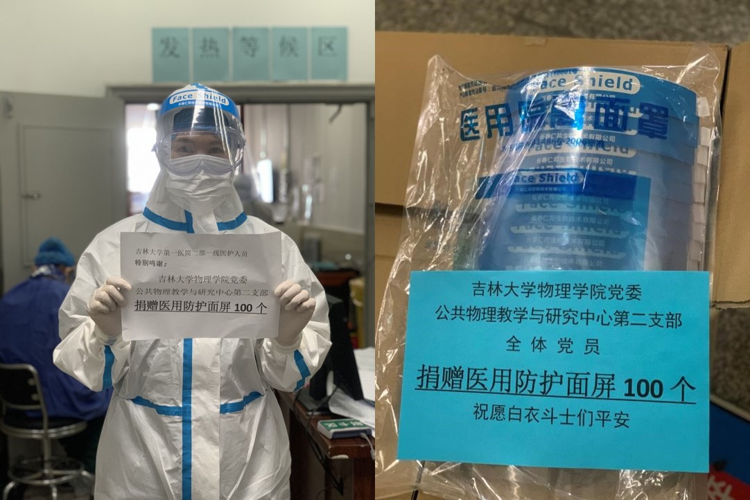 公共物理教学与研究中心第二支部党员得知目前这种情况,希望能为医院疫情防控工作尽一份自己的绵薄之力,每位党员努力寻找各种关系、各个渠道,来筹集正规厂家生产的合格医务用品。直到前几天联系到长春仁邦生物技术有限公司生产的医用隔离面罩100个,捐赠给香蕉视频 一院二部医务部。医务部张冀代表一线医护人员对各位老师表示感谢!
