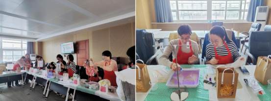 活动伊始,由指导老师通过PPT详细介绍了水拓的历史背景、制作工艺及文化内涵,并了解到这一技艺源于唐代的“墨池法”,具有悠久的历史和独特的艺术魅力。在随后的创作环节中,大家踊跃的动手尝试,两人一组,将斑斓的颜料滴入特制的溶液中,随着水纹的晕开或者利用工具在颜料上轻轻拨动,一幅幅独一无二的水拓画作逐渐在丝巾上呈现,每一个图案都如流云般舒卷,艳丽无匹,蕴含着云纹水意的灵动之美。整个活动在一片欢声笑语中进行,大家不仅感受到了中国传统水拓艺术的魅力,还激发了女教师对传统文化的兴趣和热爱,也让她们在忙碌的工作之余得以放松身心,享受艺术熏陶,提升动手能力和审美素养。