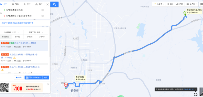 1.乘坐飞机到达长春龙嘉机场,打车至长春高新假日酒店(震宇街店)约60分钟,120元;