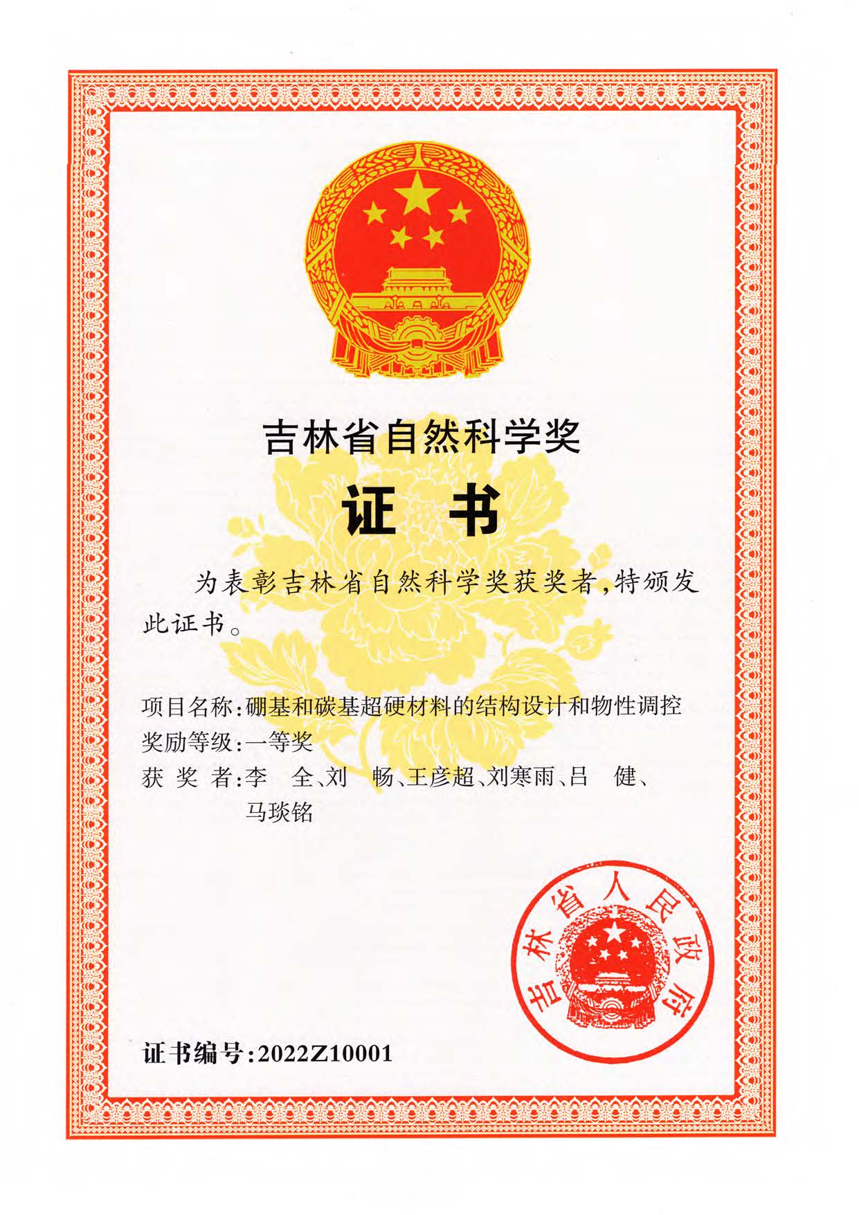 马琰铭教授研究团队完成的“硼基和碳基超硬材料的结构设计和物性调控”项目荣获吉林省自然科学奖一等奖(主要完成人:李全,刘畅,王彦超,刘寒雨,吕健,马琰铭)。