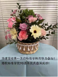 未组织大型集体现场教学。通过花艺老师制作的PPT了解插花的概念、花的品种和花语意义等等,跟着视频演示学习小提篮制作技巧。几位教师学习视频后便迫不及待的在休息室操作起来,一边选择花材,一边交流技巧,充满了欢声笑语。未能在现场的教师也通过群不断交流心得、展示自己作品,每个作品都独具风格,一时间群里热闹起来,大家仿佛都置身与花的海洋中,彻底放松了身心,享受创作的乐趣,那些普普通通的花草,经过老师的创造力和巧手的修剪后,错落有致、热情奔放的绽放在花篮里,看着自己的作品,大家感到满满的幸福感与成就感。最后,教师们以拍照的形式提交作品40余份,并将对物理70周年华诞的祝福寄语写在作品上,殷切希望香蕉视频
