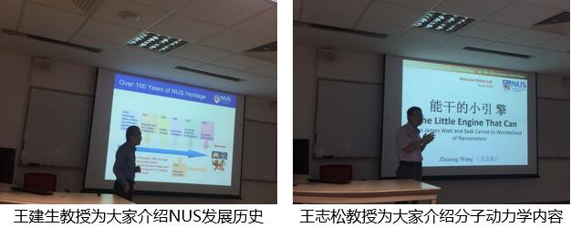 新加坡国立大学王建生教授介绍NUS发展历史、王志松教授作了学术报告。在博士后带领下参观了该校物理系实验室以及2D材料科学中心,介绍了各实验室的实验设施、主要工作内容、研究方向,回答了同学们的疑问。