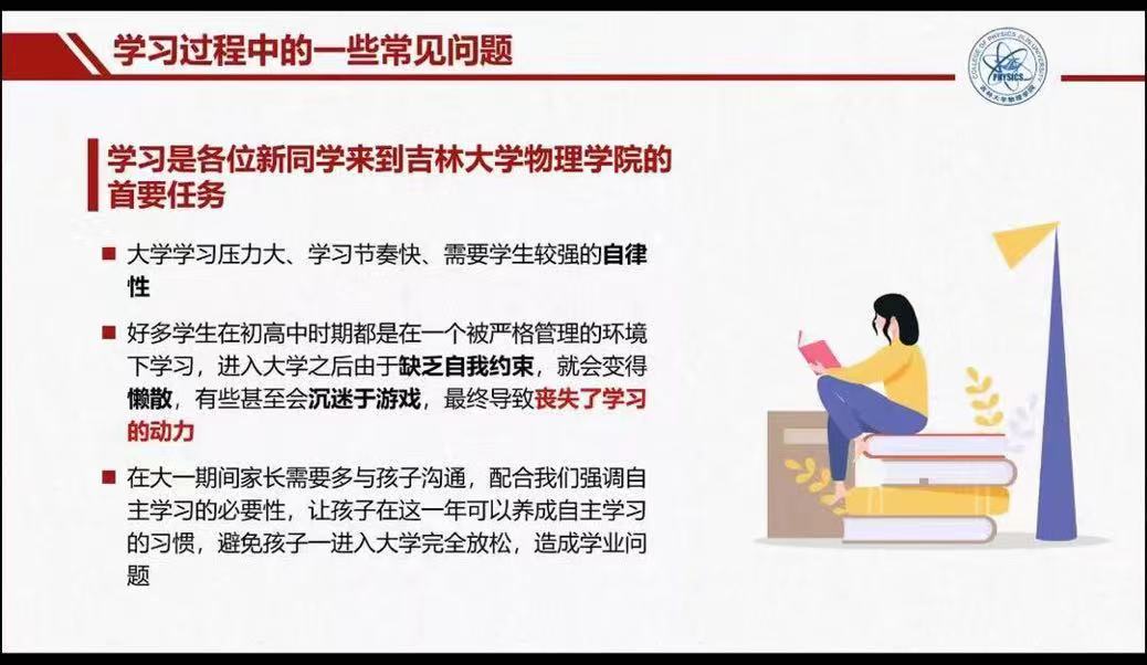 的育人体制机制,学科特色,以及毕业生去向等方面。辅导员刘扬对新生的报到流程,以及四年之中的学习,生活等方面进行了讲解。最后,根据家长们的提问,老师们进行了逐一回答。