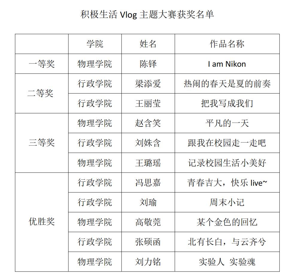 本次活动题材不限,同学们可以借助手机、相机等设备,以独特、新颖的角度多层面、全方位展现校园中的美景以及丰富的校园生活。活动一经发布,受到两院同学们的热烈响应,共计征集到vlog作品36份。同学们的作品选材丰富、内容多彩、制作精美,用心和镜头记录着校园生活中的美好,或是吐露对大学生活的感受与心声,或是记录自己的一天,或是分享“我”眼中的校园美景。经过评审,大赛最终评选出一等奖1名、二等奖2名、三等奖3名以及优胜奖5名。其中,香蕉视频