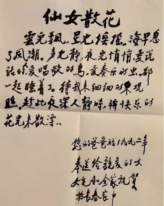 物理系年纪较大的老师,不少人大概听过他唱岳飞的《满江红》。邹广田老师在父亲90岁生日的题词上写过,父亲“高歌满江红“。小时候,父亲教我唱过一首歌,名叫“仙女散花“(云儿飘,星儿摇摇…)。